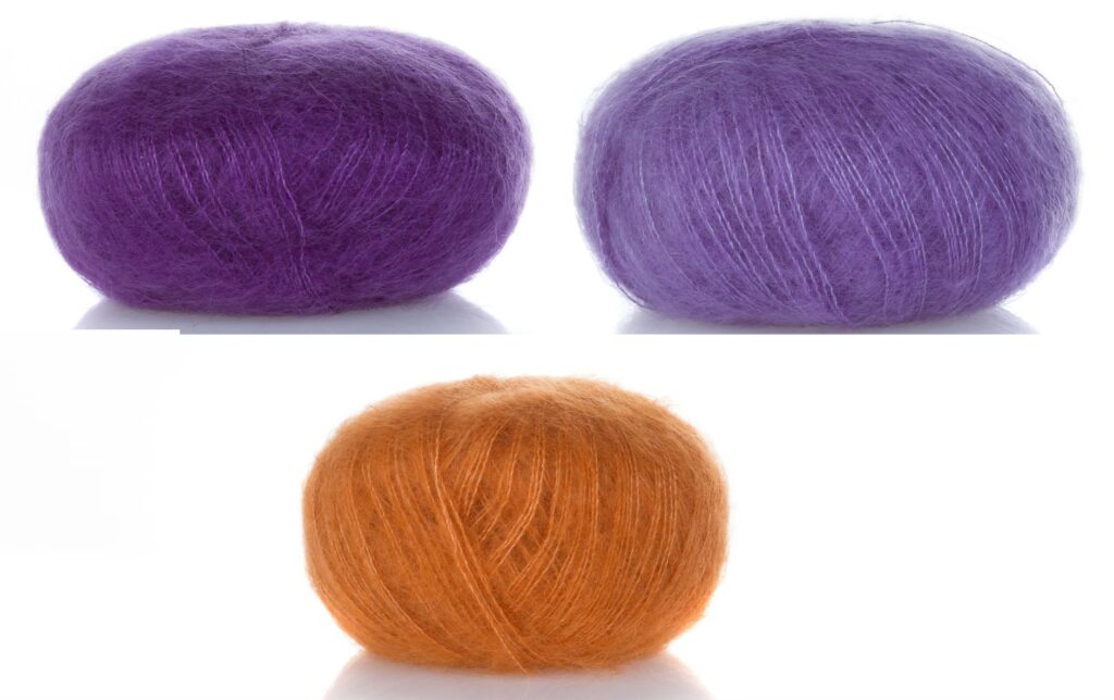 Вам потребуется: пряжа FERNER “Kid Mohair uni” (72%  мохера, 28% шелка; 210 м /25 г) — 250 (275) 300 г лиловой, 200 (225) 250 г сиреневой и 125 (150) 175 г оранжевой; спицы № 4 и 5; круго­вые спицы № 4.