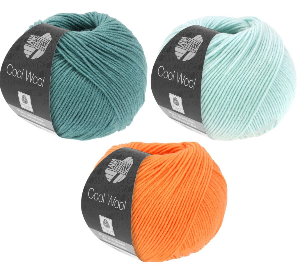 Вам потребуется: пряжа 1 – LANA GROSSA “Cool Wool” (100% шерсти; 160 м/50 г) — 300 (350) 350 г цв. морской волны, 100 г светло-бирюзовой и 50 г оранжевой;