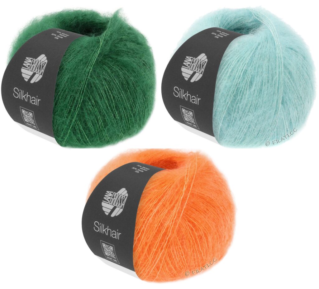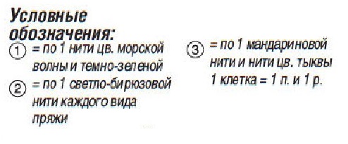 пряжа 2 – LANA GROSSA “Silkhair” (70% мохера, 30% шелка; 210 м/ 25 г)-100 (125) 125 г темно-зеленой, 50 г светло-бирюзовой и 25 г цв. тыквы; спицы N° 4 и 5; круговые спицы №4.