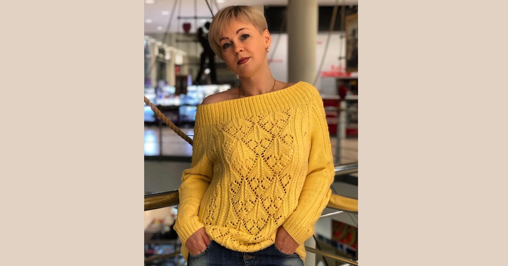В этом пуловере привлекает все: красивый ажурный узор, широкий вырез, открывающий плечи, и конечно, солнечный желтый цвет!