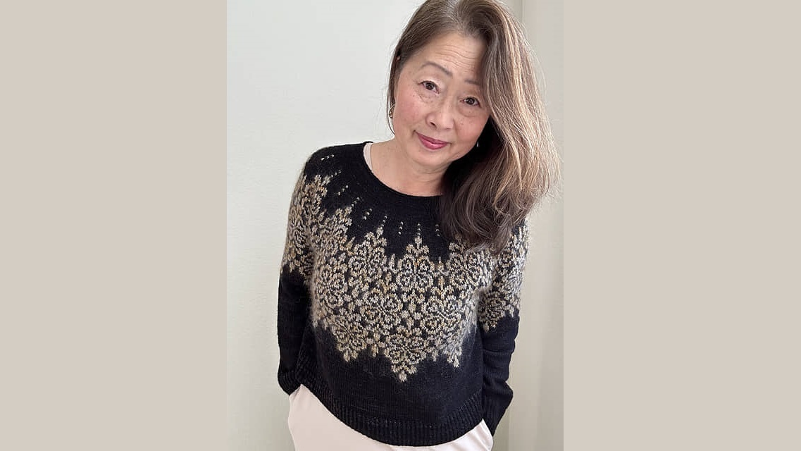 Джемпер с красивым жаккардовым узором вяжется спицами сверху вниз без швов.