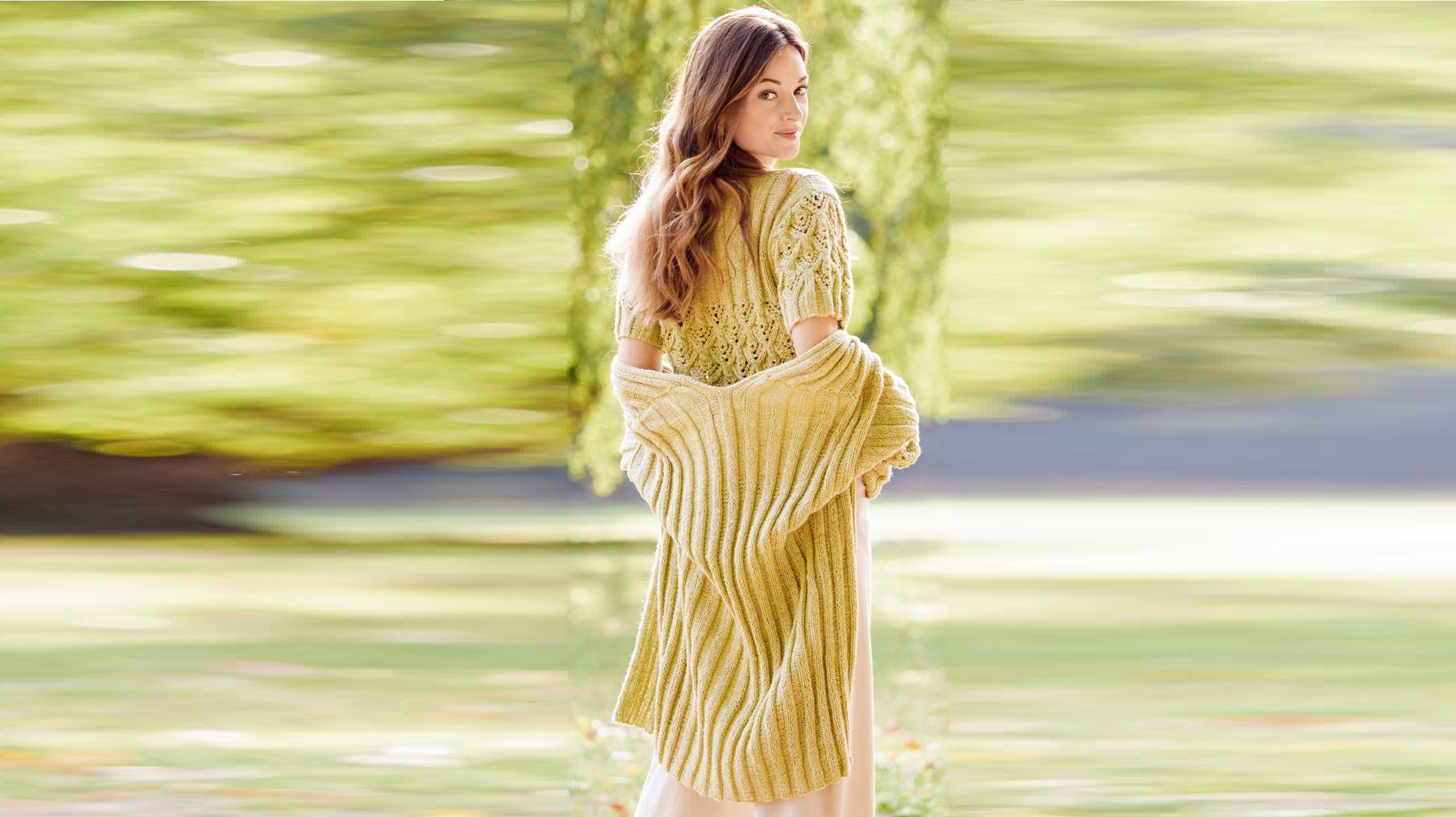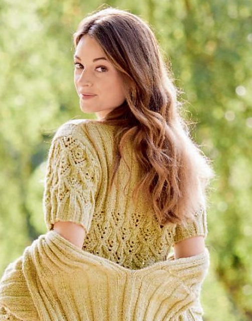 Кардиган и пуловер с короткими рукавами связаны широкой резинкой и ажурными «косами» из одинаковой пряжи нежно-зеленого цвета.