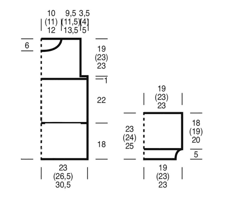 Через 14 см = 40 р. от планки прибавить с обеих сторон для скосов 1 х 1 п., за¬тем в каждом 4-м р. 18 x 1 п. и в каждом 2-м р. 2 х 1 п. (в каждом 6-м р. 5 х 1 п. и в каждом 4-м р. 11 х 1 п.) в каждом 4-м р. 17 х 1 п. и в каждом 2-м р. 4 х 1 п. = 116 (126) 136 п.