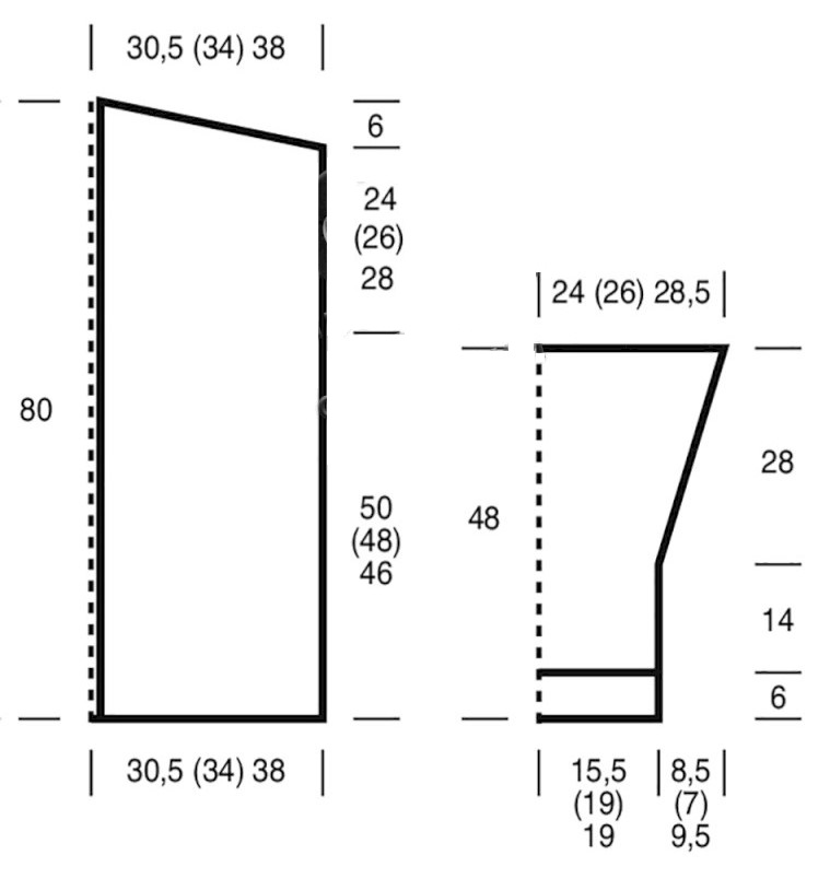 Через 20 см = 56 р. (24 см = 68 р.) 24 см = 68 р. от начала вязания узором 1 закрыть оставшиеся 23 (28) 32 п.