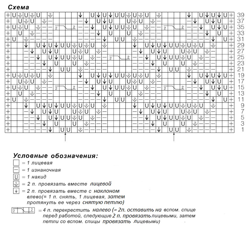 Узор 2. Ажурный узор из «кос» (число петель кратно 18 + 2 кромочные). Вязать по схеме. На ней даны только лицевые ряды; в изнаночных рядах петли провязывать по рисунку, накиды провязывать изнаночными. Начать с петель перед правой стрелкой, постоянно повторять раппорт из 18 п. между стрелками и закончить петлями после левой стрелки. Выполнить 1 раз 1-40-й р., затем постоянно повторять 21-40-й р.