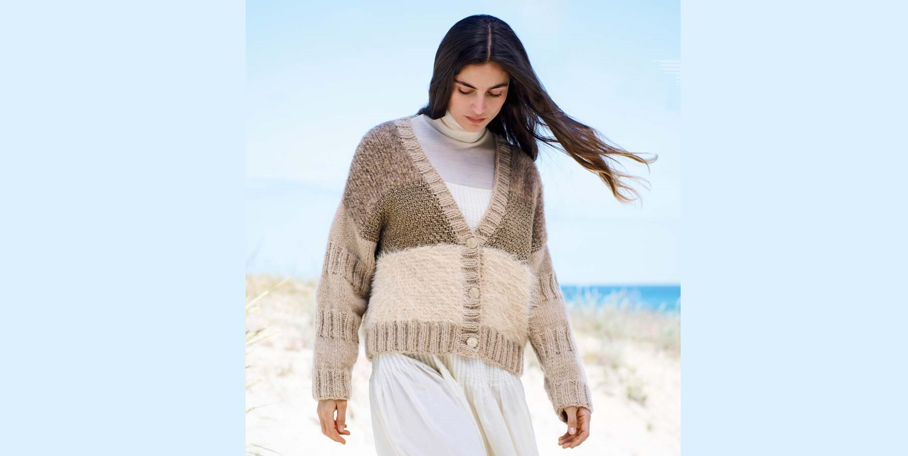 13,5 п. и 23 р. узора “плетение” с Lucida и спицами № 7,5 = 10 x 10 см;