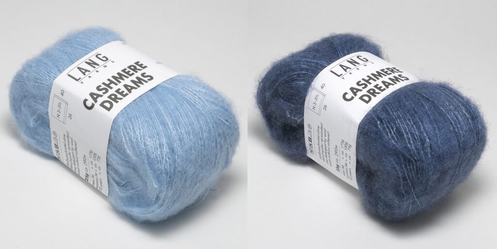 пряжа 2 – LANGYARNS “Cashmere Dreams” (65% кашемира, 35% шелка; 290 м/25 г) — по 75 (100) г голубой Hellblau (Fb 0021) и джинсово-голубой Jeans (Fb 0034); спицы № 5 и 5,5; круговые спицы N° 5.