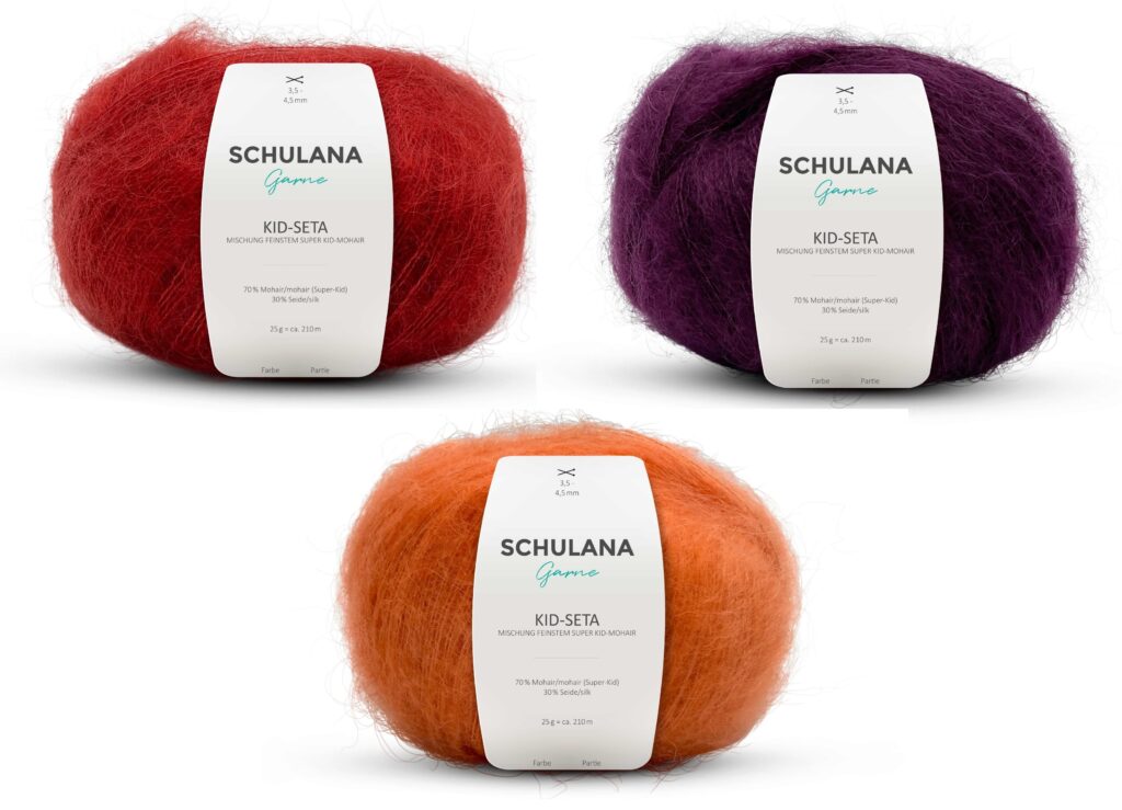Вам потребуется: пряжа SCHULANA “Kid Seta” (70% мохера, 30% шелка; 210 м /25 г) – 175 (200) 225 г персикового цвета Nektarine (Fb 124) и по 25 (50) 50 г баклажанового Aubergine (Fb 40) и темно-оранжевого цветов Dunkelorange (Fb 119); спицы № 5 и 6; круговые спицы № 5; 3 пуговицы диаметром по 22 мм.