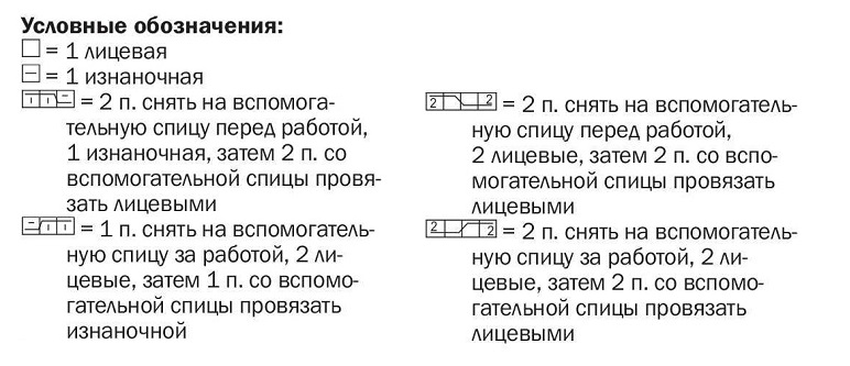 Лицевые ряды: кромочная, попеременно 1 изнаночная, 1 лицевая, закончить 1 изнаночной и кромочной. Изнаночные ряды: все петли вязать по рисунку.