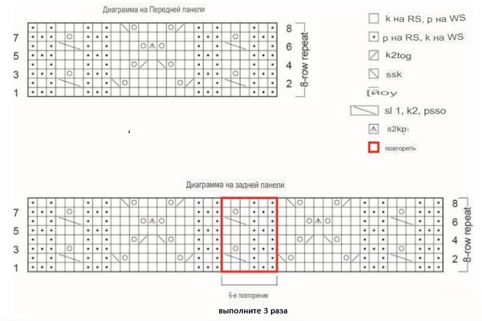 6 ряд: 1 изнаночная, 1 лицевая, 1 изнаночная, 1 снятая, 2 лицевые, снятие с накидом, 1 изнаночная, 1 лицевая, 1 изнаночная, 3 лицевые, накид, снятие с накидом, накид, 3 лицевые, (1 изнаночная, 1 лицевая, 1 изнаночная, 1 снятая, 2 лицевые, снятие с накидом) 3 раза, 1 изнаночная, 1 лицевая, 1 изнаночная, 3 лицевые, накид, s2kp, yo, k3, p1, k1, p1, sl 1, k2, psso, p1, k1, p1.