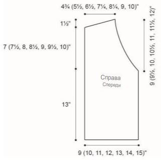 Следующий ряд): закрыть 5 (6, 7, 7, 8, 9, 10) петель, вязать до края горловины; с другой стороны закрыть 3 петли, затем вязать до конца ряда.