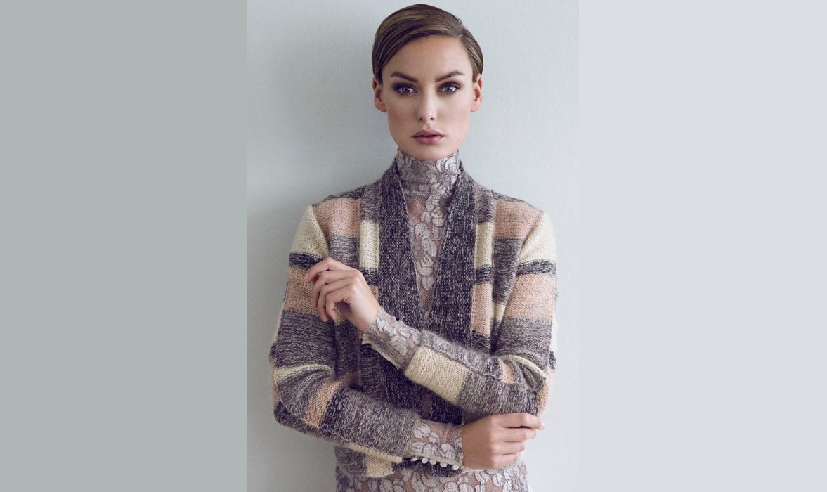 Женский жакет, вязаный спицами из двух видов пряжи пяти цветов.