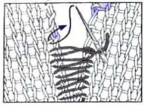 Матрасный шов выполняется с лицевой стороны. Положите детали рядом друг с другом лицевой стороной наверх. Начинайте выполнять шов с нижнего края и соедините сначала наборные ряды, начиная с правой детали. Затем подхватите протяжку между последней и кромочной петлей левой детали снизу вверх и протяните нить. Далее подхватите протяжку между последней и кромочной петлей правой детали, протяжку между кромочной и первой петлей левой детали и протяните нить. Через 2-3 см нить затяните.