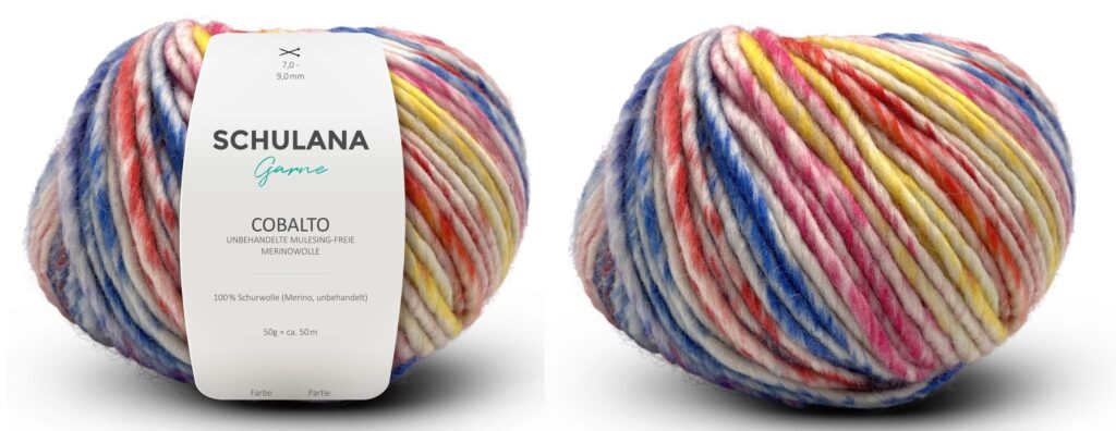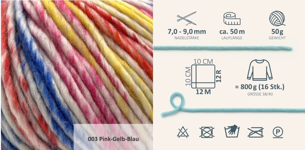 Вам потребуется: принтованная пряжа SCHULANA”Cobalto”  (100% овечьей шерсти; 50 м/50 г) — 850 (900) 950 г розово-желто-сине-белой Pink-Gelb-Blau (Fb 03); спицы № 7 и 8; круговые спицы № 7.