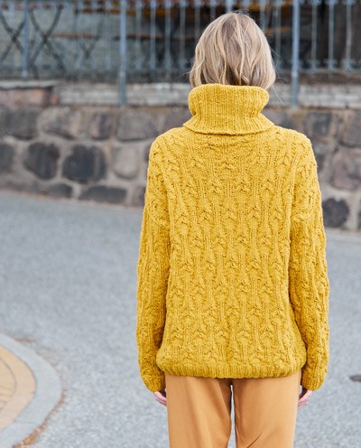 Пряжа с высоким содержанием хлопка осенью все еще актуальна, как и ярко-желтый цвет нашего пуловера с «косами». У него свободный крой, поэтому можно дополнительно утеплиться, и объемный воротник гольф тоже не даст замерзнуть.
