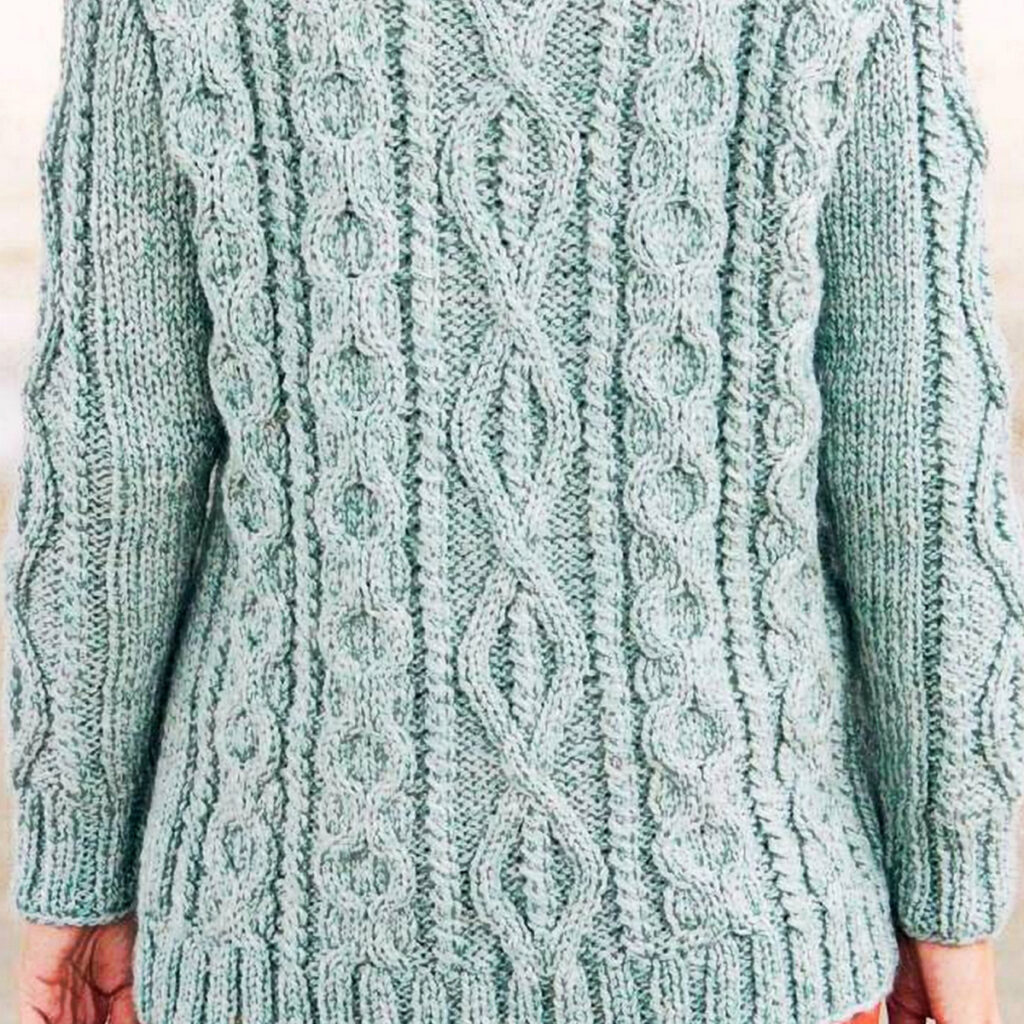 для пуловера: пряжа BUTTINETTE “Woll Butt Primo Noelle” (80% полиакрила, 20% шерсти; 170 м/ 100 г) – 600 (700) 800 [900] г мятно- голубой меланжевой меланжевой мятно-голубой (цвет № 103 802) ; спицы № 7;