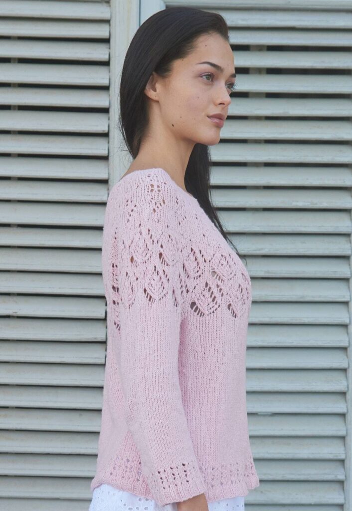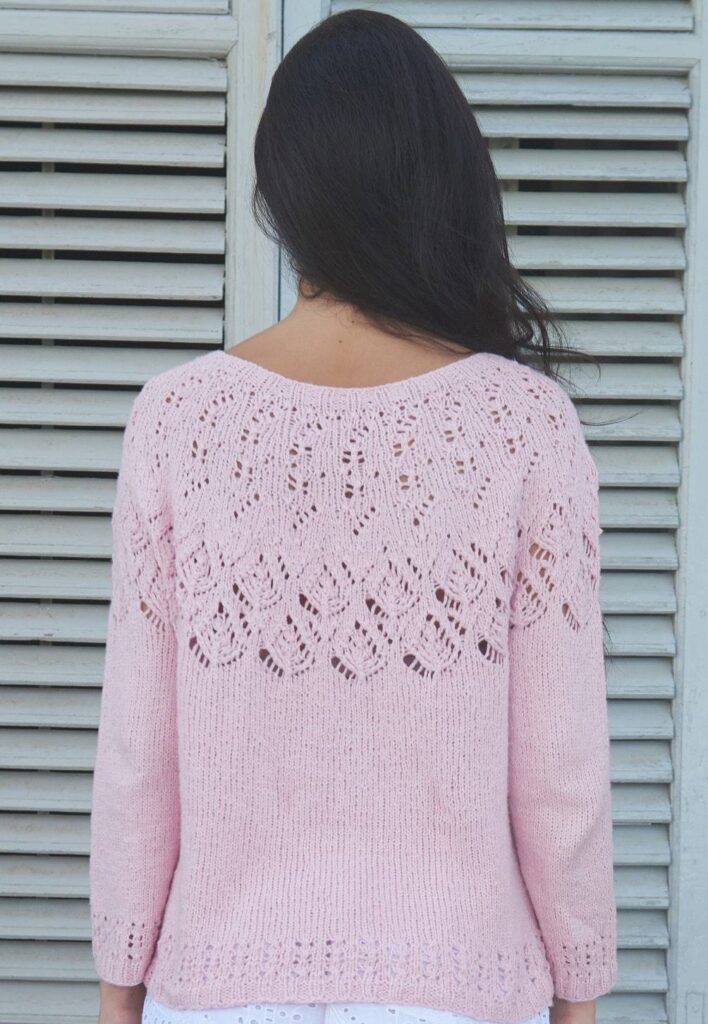 Розовые оттенки тонко настраивают на нужный лад, подходят любому цвету лица и хорошо вписываются в свежую весеннюю гамму. Эта модель вяжется по кругу сверху вниз: сначала кружевная кокетка, затем лицевой гладью выполняются перед со спинкой и отдельно рукава. Завершают картину ажурные бордюры и планки в резинку.