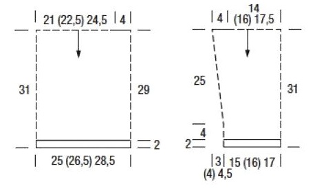 Для скосов рукава убавить 6 раз в каждом 12-м р. (3 раза в каждом 8-м р. и 5 раз в каждом 10-м р.) 7 раз в каждом 8-м р. и 2 раза в каждом 10-м р. по 2 п., для этого в начале кругового ряда провязы- вать 2-ю и 3-ю п. вместе с наклоном влево (= 1 п. снять, как лицевую, 1 лицевая, затем протянуть ее через снятую петлю) и в конце кругового ряда провязывать 2-ю и 3-ю п. вместе лицевой = 60 (64) 68 п.