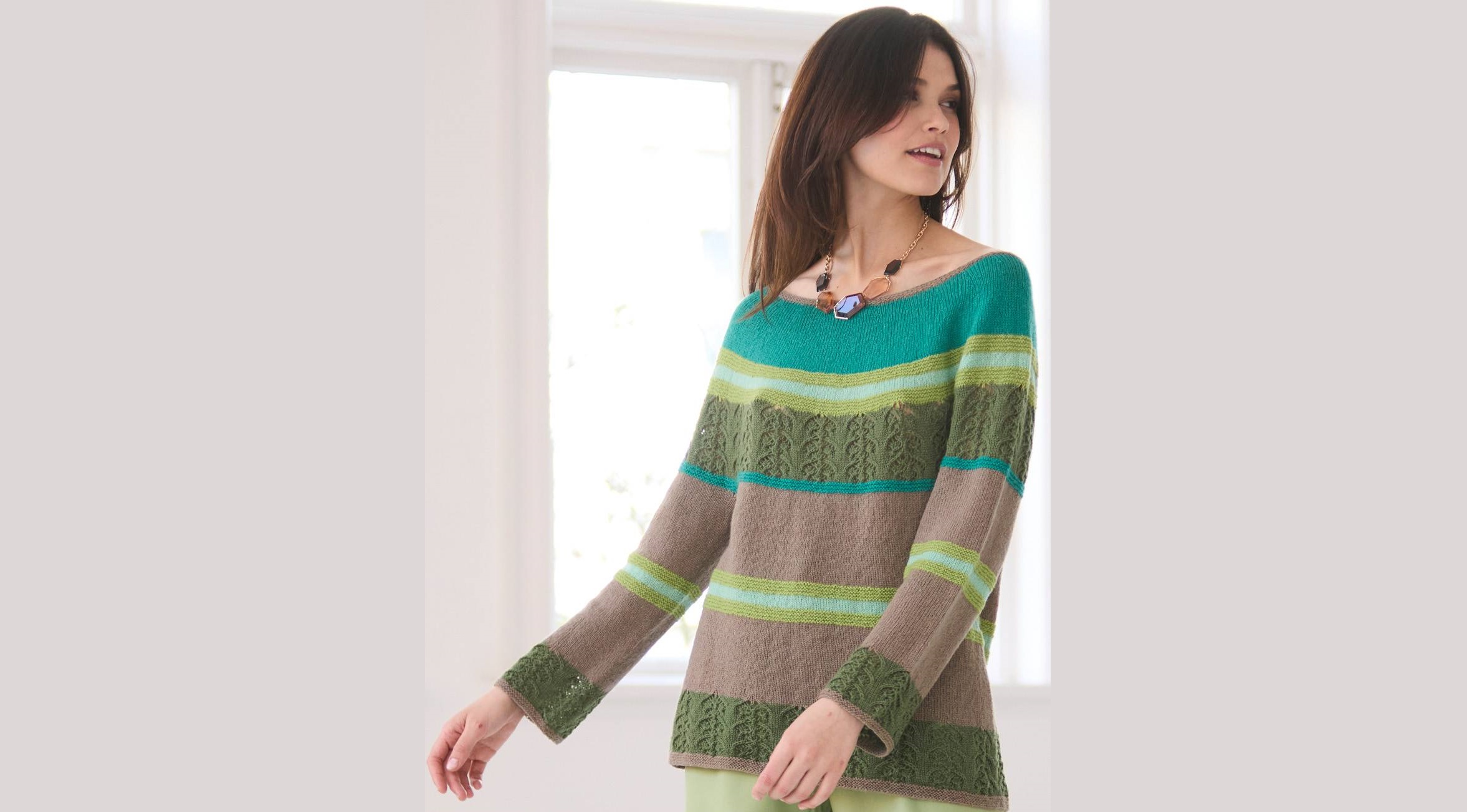 Вам потребуется: пряжа LANGYARNS “Noelle” (79% шерсти, 21% полиамида; 185 м/25 г) — 75 (75) 100 г коричневой, по 50 (50) 75 г зеленой и бирюзовой, 25 (50) 50 г светло-зеленой и 25 (25) 50 г мятной; круговые спицы № 3,5; 1 комплект чулочных спиц №3,5.