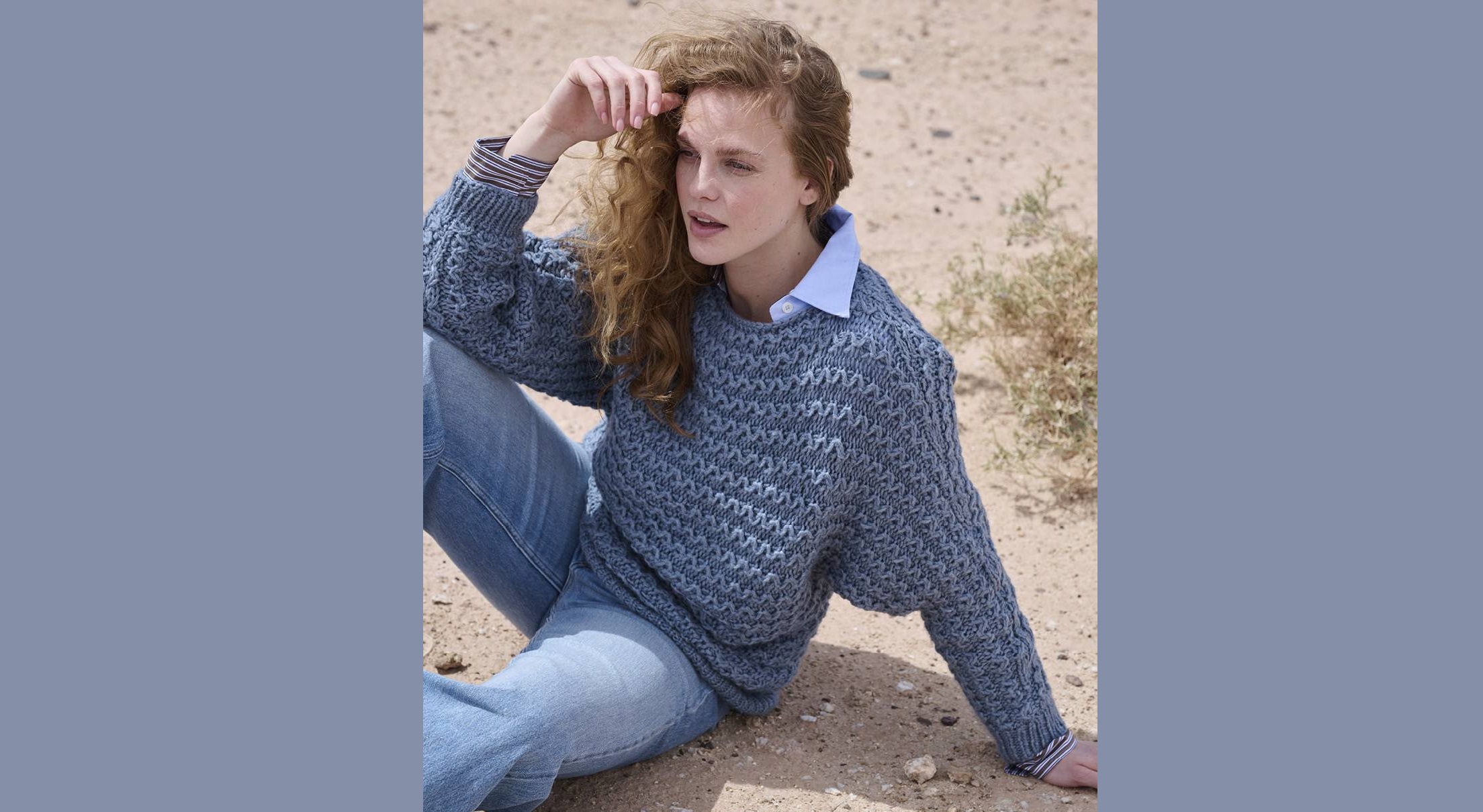Но самое привлекательное здесь — дымчато-синий оттенок пряжи, который всем к лицу и подходит для любого времени года