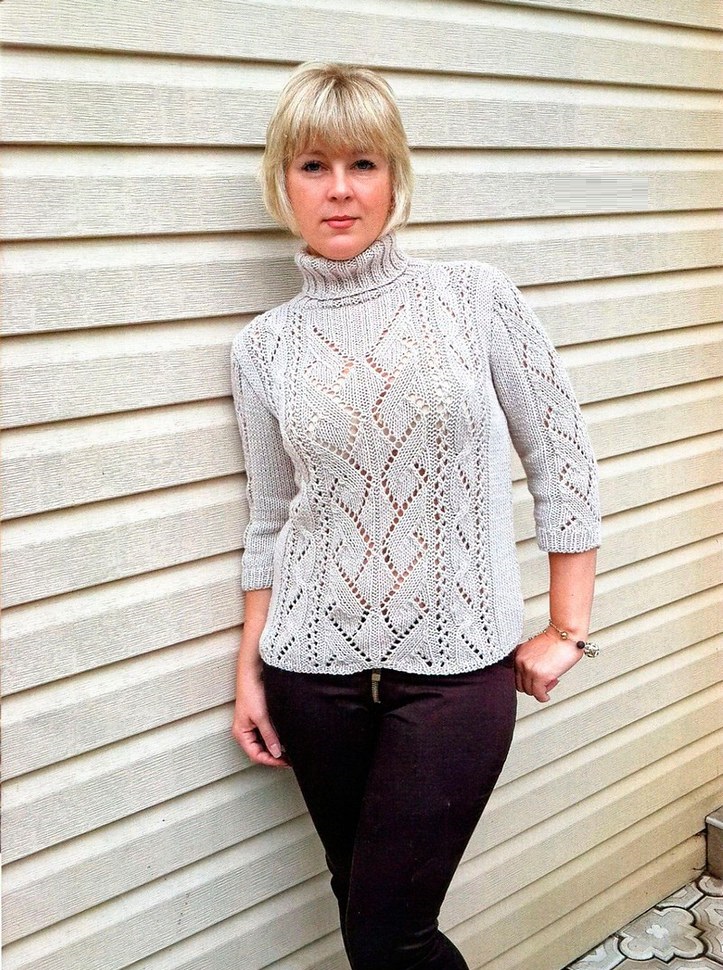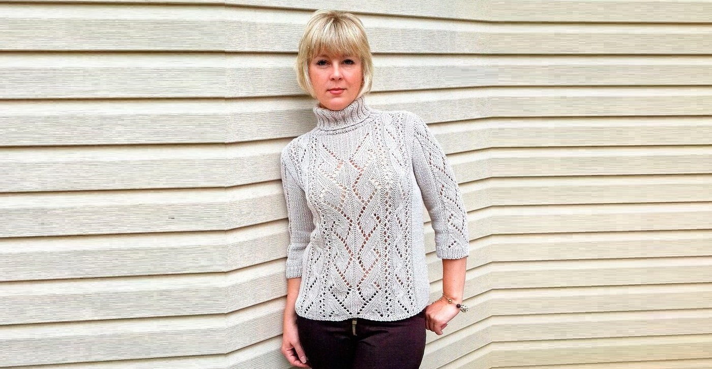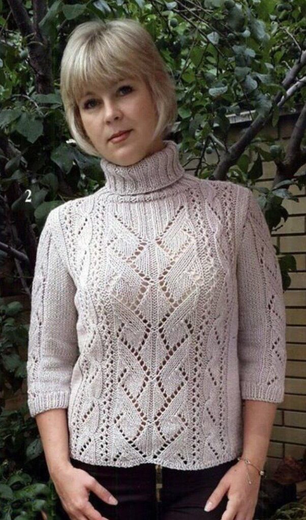Ритм центрального узора поддержан вертикальными дорожками ажура по бокам, что в сочетании с пудреным цветом пряжи создает приятную гармонию