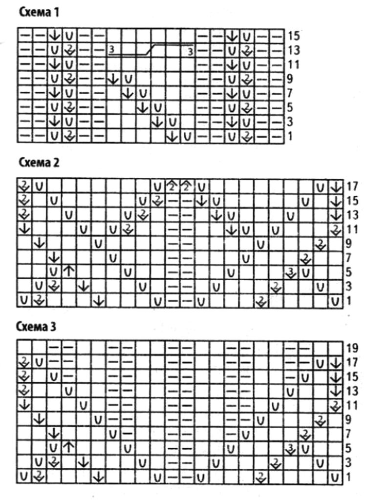вяжите аналогично спинке, но на высоте 41 см от начала 22 п. центрального узора (6-й раппорт в высоту) вяжите по схеме 3 и по окончании повторяйте 19-й-20-й ряды.