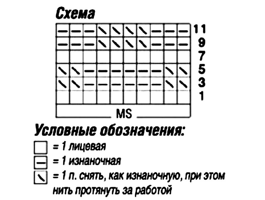 В изнаночных рядах петли провязывать по рисунку, снятые петли вновь снимать, при этом нить располагается перед петлей.