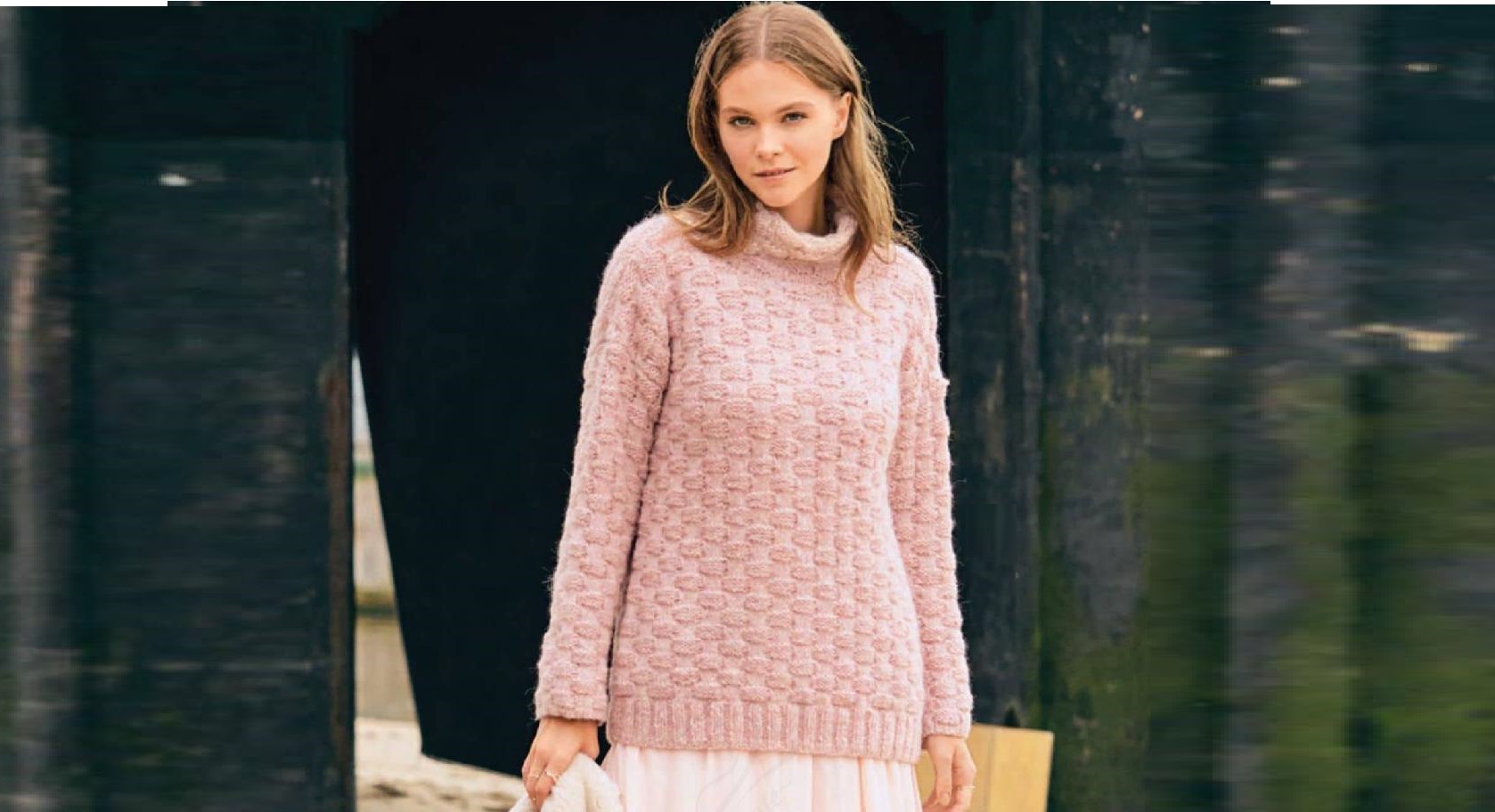 В настоящее время свитер – это не только спортивная одежда, но и одежда для офиса и вечернего времяпровождения. В свитере нежного розового оттенка привлекает не только объемная рельефная структура, но и великолепная комбинация мягкой шерсти альпака с мерцающей нитью