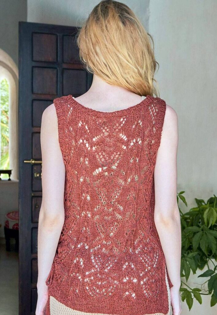В основе экстравагантного топла с высокими разрезами изысканная смесь льна, хлопка и вискозы. Потрясающий кружевной узор потребует усилий и некоторого опыта, а вот завязки, соединяющие боковые стороны переда и спинки, кажутся обычной резинкой