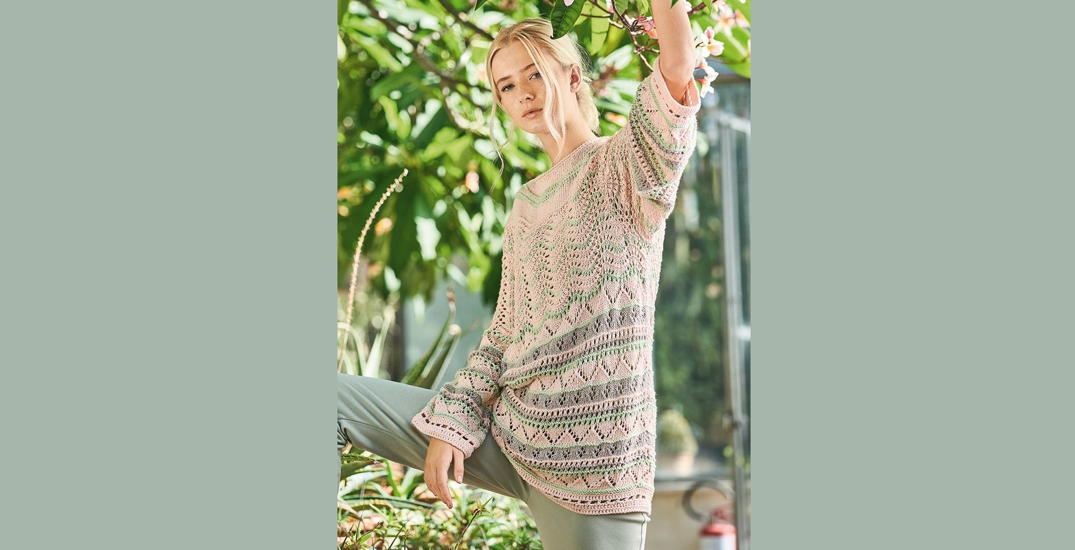То волны, то зигзаги, то сквозные дорожки – игра узоров на длинном пуловере дополнена чередованием трех пастельных оттенков: лососевого, мятного и бежевого.