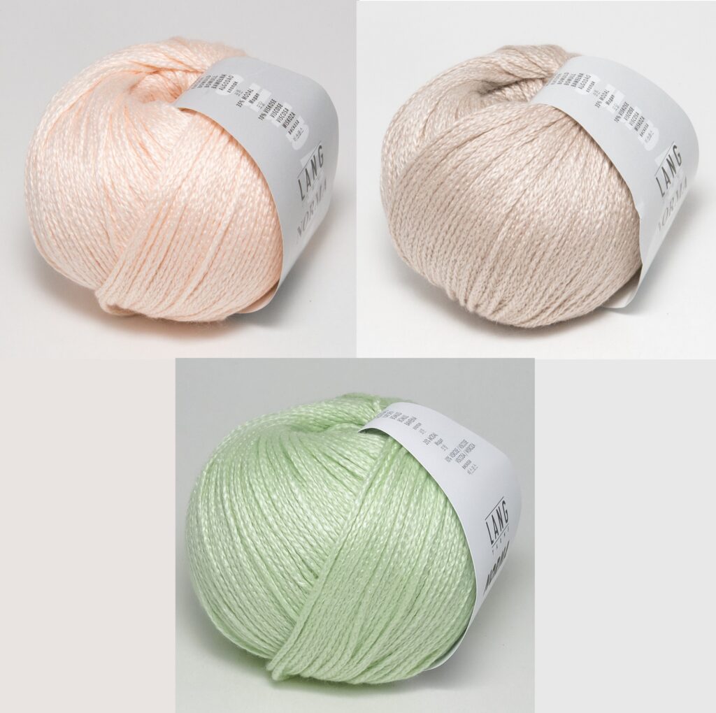 Вам потребуется: пряжа LANGYARNS “Norma” (55% хлопка, 45% вискозы; 135 м/ 50 г) — 300 (400) г лососевой, по 150 (250) г бежевой и мятной; спицы № 4,5; крючок № 3,5.