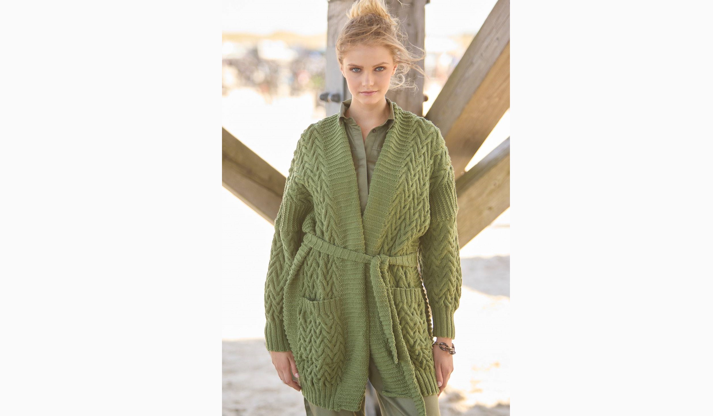 Секрет успеха удлиненного жакета с большими карманами — в соединении поперечной резинки и стилизованных «кос», что создает интересный визуальный эффект и бросает вызов мастерам вязания. Завязывающийся пояс подчеркивает талию.