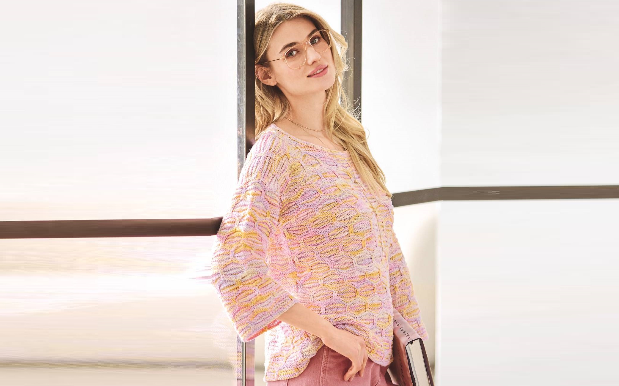 Просто радостно смотреть на этот пуловер прямого силуэта с рукавами три четверти! Узор из снятых петель вязать несложно, а пестрый рисунок появляется сам собой благодаря пряже секционного крашения в пастельных тонах.