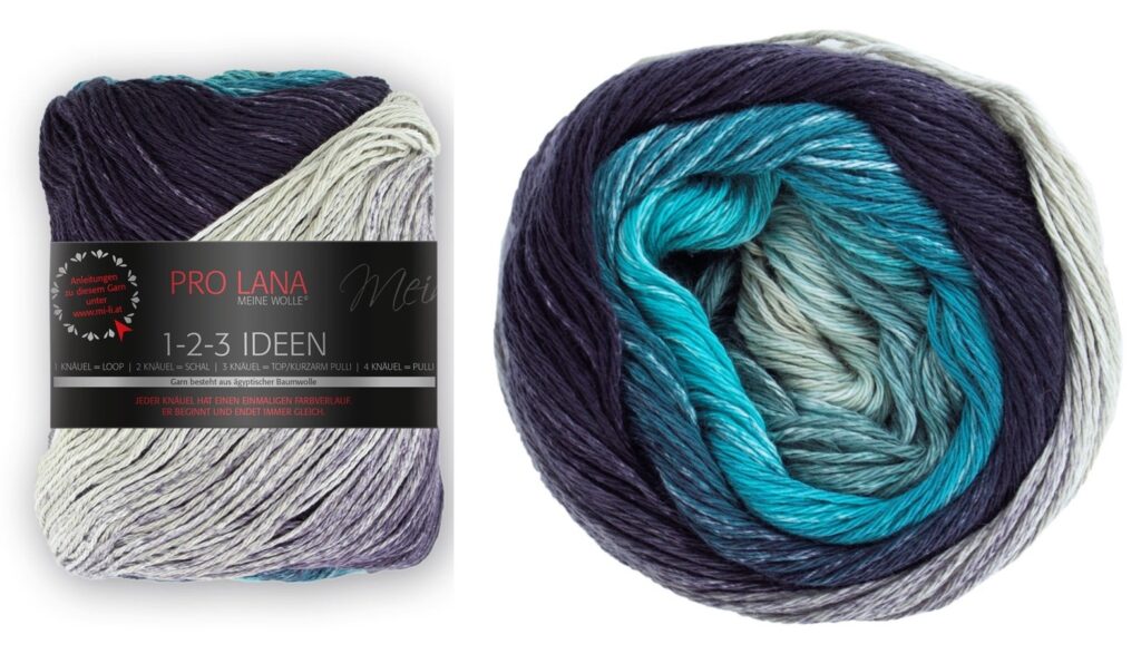Вам потребуется: пряжа секционного крашения PRO LANA “1-2-3 Ideen” (100% хлопка; 315 м/ 100 г) — 300 г в серо-бежево-голубых тонах Ozean (Fb 10); круговые спицы № 4.