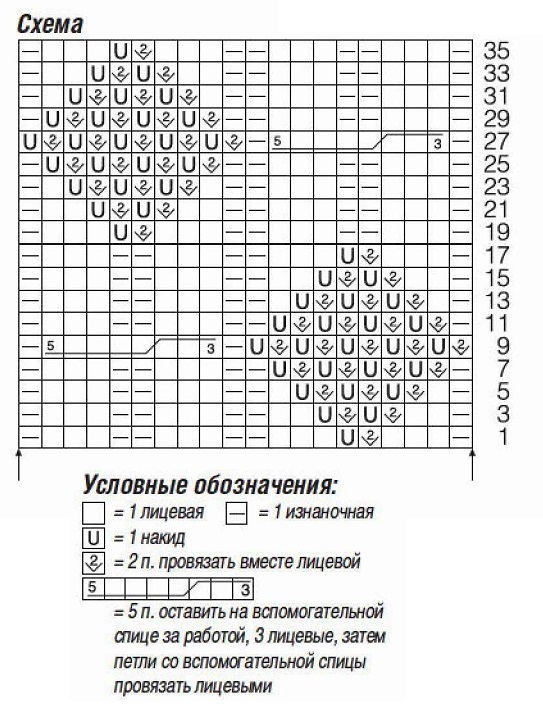 Узор 2 . Узор из ромбов (число петель кратно 20) . Вязать по схеме. На ней даны только нечетные круговые ряды; в четных круговых рядах петли провязывать по рисунку, накиды провязывать лицевыми. Постоянно повторять раппорт из 20 п. между стрелками. Выполнить 3 раза 1—36-й круг. р.