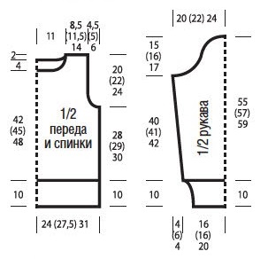 Вязать, как спинку, но для более глубокой горловины уже через 42 см = 138 р. (45 см = 148 р.) 48 см = 158 р. от нижней планки закрыть средние 25 (24) 25 п. и обе стороны закончить раздельно.
