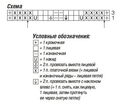 Плотность вязания: узор 2 — 20 п. х 33 р. = 10 х 10 см.