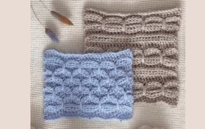 Вы можете носить эту модель из приятной шелково-хлопковой пряжи в качестве топа, как показано здесь, или использовать в роли жилета, если станет прохладно. Узор из снятых петель вяжется легко, а сочетание двух оттенков синего придает глубину объемной сотовой структуре.