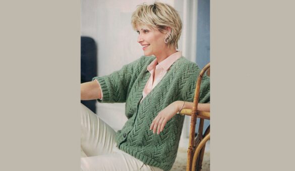 Женский вязаный спицами кардиган с рукавами реглан от дизайнера Kim Hargreaves.