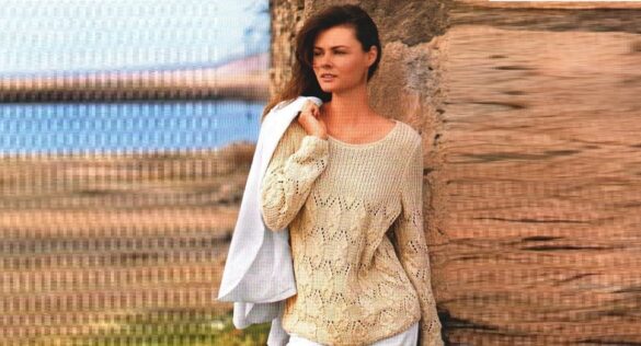 Изысканный пуловер с короткими рукавами связан фантазийным ажурным узором из тонкой пряжи (смесь вискозы, хлопка и льна) . Такой пуловер идеально комбинируется с юбкой или брюками и вы будете себя чувствовать комфортно даже жарким летним днем.