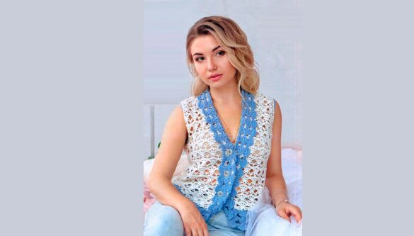 Двухцветный ажурный пуловер создает иллюзию прозрачности благодаря кружевному узору, обрамленному сверху закругленной двухцветной кокеткой, а снизу — такой же планкой.