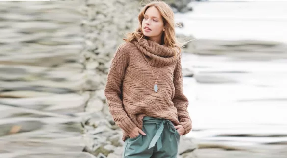 В свите классической формы с воротником гольф, выполненном из прочной пряжи с шерстью и хлопком, изюминкой является шахматный узор из «кос» и платочной вязки