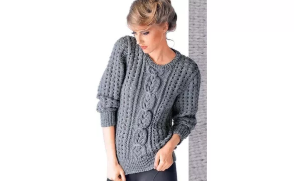 В этом пуловере изящна каждая деталь! Переплетения аранских узоров на рукавах, спереди и на спинке просто великолепны. Вертикальные рельефы делают любую фигуру стройнее. Резинка и маленькие разрезы в боковых швах придают женственность силуэту