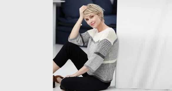 Этот очаровательный свитер с широкими рукавами в виде фонарика связан продольным узором из "Кос", что поможет вам выглядеть в нём ещё стройнее.