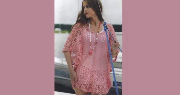Легкий летний пуловер связан спицами сетчатым узором из меланжевой ленточной пряжи голубого цвета.
