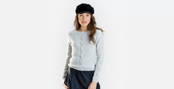 Благодаря тонким пушистым ниткам из мохера и шелка классический пуловер с 7-вырезом получается легким как перышко и удивительно нежным. Модель также отличается продуманным дизайном: регулярные прибавки по центру и убавки по краям обеспечивают У-образное расположение узора на всех деталях.