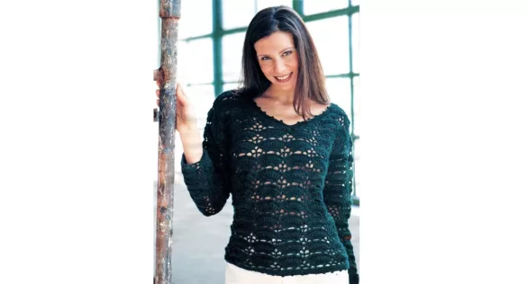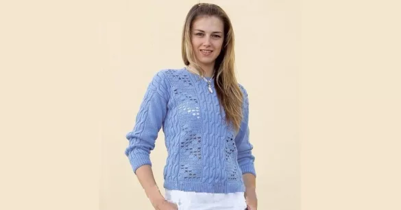 Любительницам ажурных вещей - новая интересная модель пуловера, связанная из 100% хлопка. Разнообразие в нее вносит диагональный узор. Изделие отлично подходит для теплых дней и модницам оно понравится.