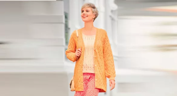 Кардиган солнечного цвета великолепно впишется в ансамбль с песочным хлопковым топом. Всем, кто собирается в отпуск, стоит поторопиться и связать себе такую двойку.