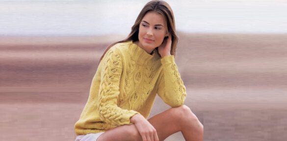 Красивые узоры из «кос» можно связать не только спицами, но и крючком – это демонстрирует нарядный пуловер желтого цвета.