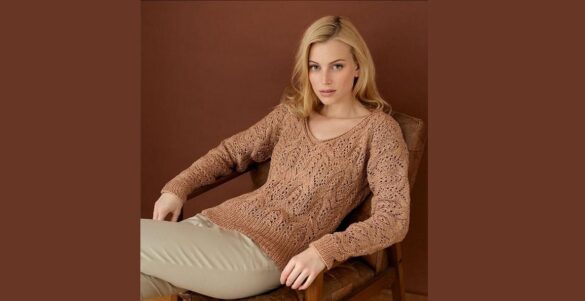 Этот длинный пуловер привлекает разнообразием ажурных мотивов: от «листьев» до «кос». Фиолетовый цвет становится еще выразительнее благодаря загадочному мерцанию пайеток и бархатистой глубине вязаного полотна.